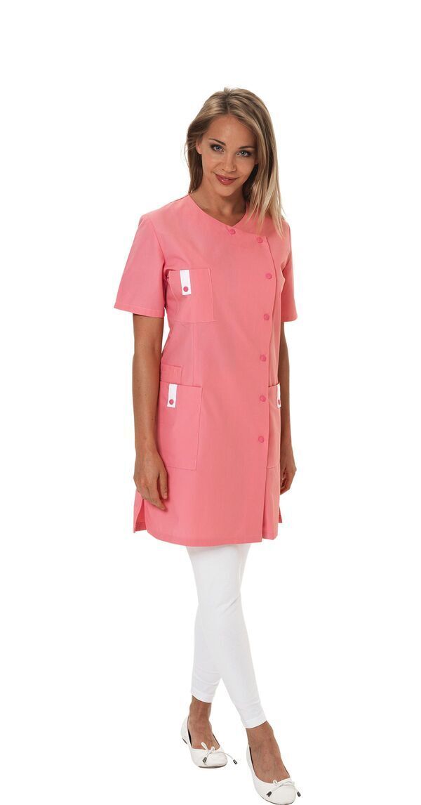 Blouse femme. Fermeture asymétrique par boutons-pressions. 2 poches basses. 1 poche BIP. Poche poitrine. Manches courtes. Fentes côtés. Longueur : 90 cm.
