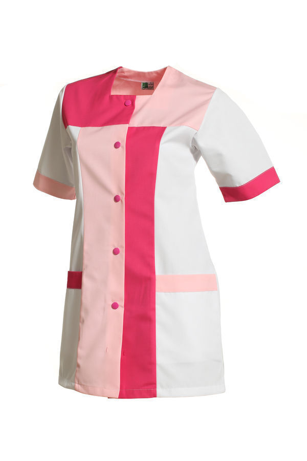 Tunique femme. Encolure carrée. Fermeture milieu devant par 5 boutons-pression contrastés. Jeux d'empiècements colorés sur le devant. 2 poches basses. Manches courtes montées à parement contrastant. Longueur : 80 cm.