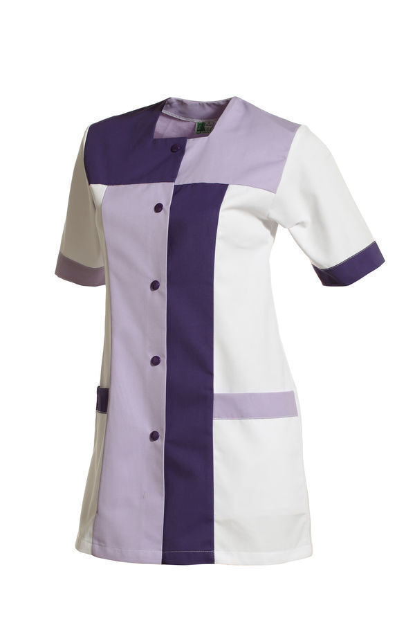 Tunique femme. Encolure carrée. Fermeture milieu devant par 5 boutons-pression contrastés. Jeux d'empiècements colorés sur le devant. 2 poches basses. Manches courtes montées à parement contrastant. Longueur : 80 cm.