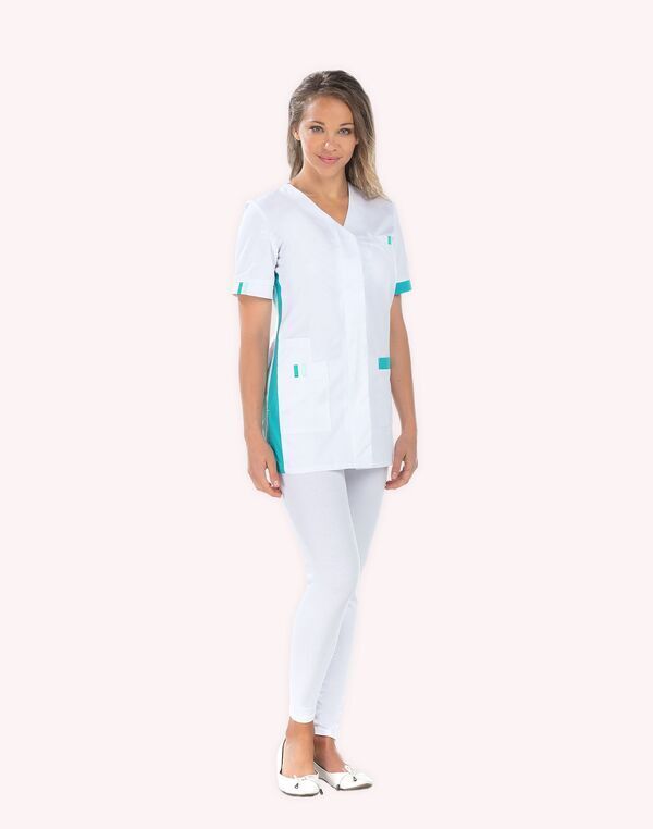 Tunique femme. Col V. Fermeture milieu devant par boutons-pression. Poche poitrine passepoilée, poche BIP, 2 poches basses et 2 fentes. Manches courtes. Empiècements contrastés aux côtés, poches et bas de manches. Longueur : 75 cm.