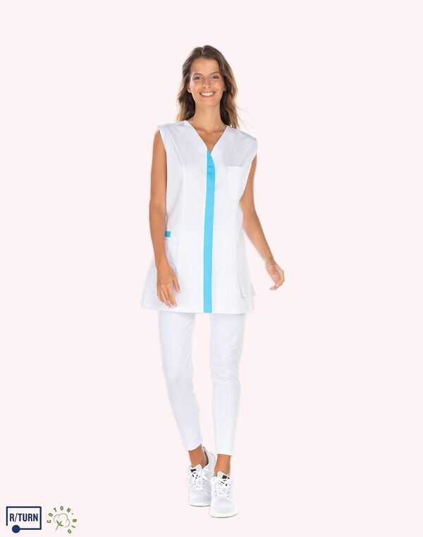 Tunique encolure V. Fermeture milieu devant par boutons-pression, parement contrasté. Découpe de cintrage. Poche poitrine, poche BIP. 2 poches basses semi-volantes. 2 fentes dos. Longueur : 75 cm.