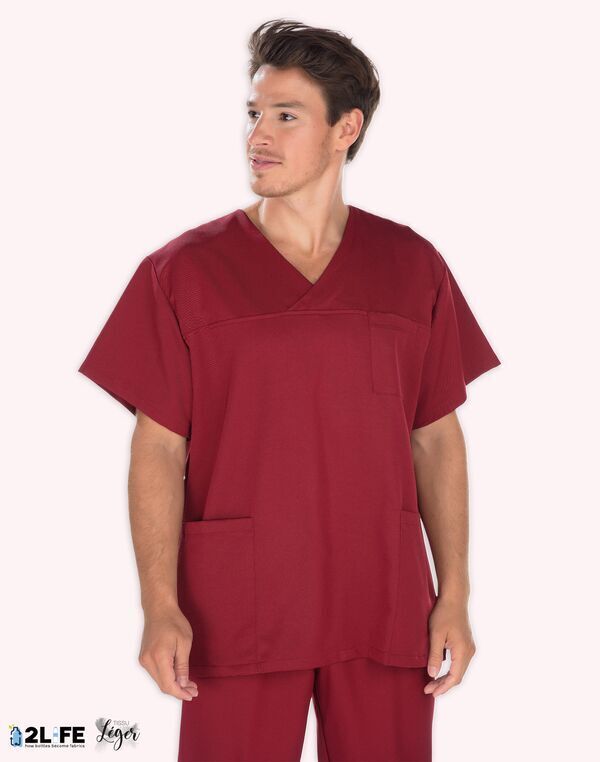 Tunique mixte encolure V. Poche poitrine, 2 poches basses. Fentes côtés. Manches courtes. Longueur : 75 cm.