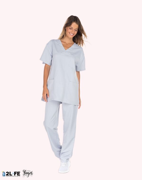 Tunique mixte encolure V. Poche poitrine, 2 poches basses. Fentes côtés. Manches courtes. Longueur : 75 cm.
