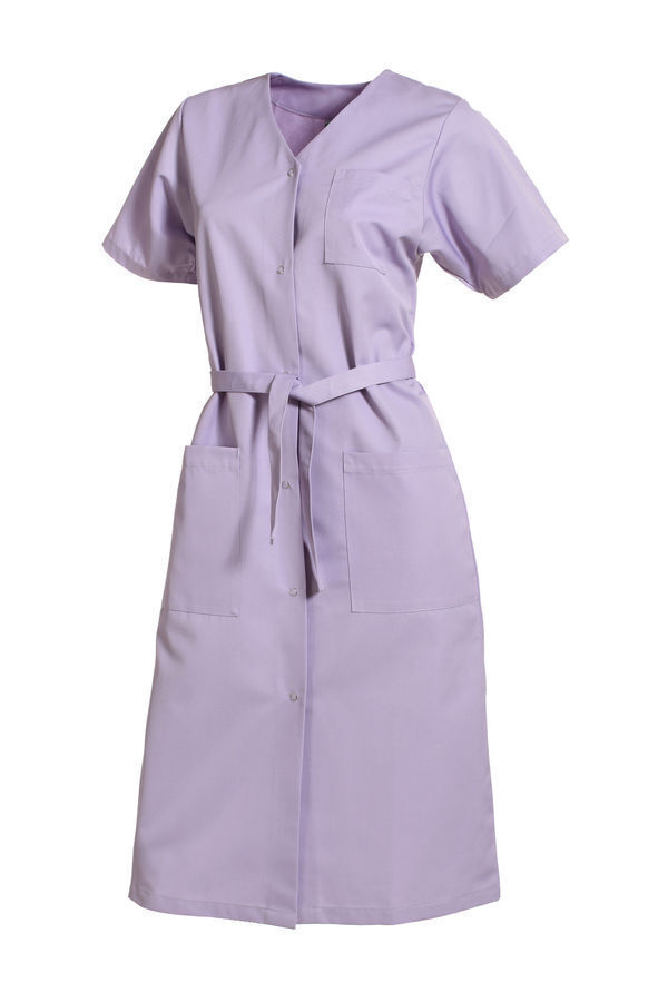 Blouse femme encolure V. Fermeture milieu devant par 6 grippers. Ceinture amovible. Poche poitrine et 2 poches basses plaquées. Manches courtes avec pattes pressionnées. Longueur : 105 cm.