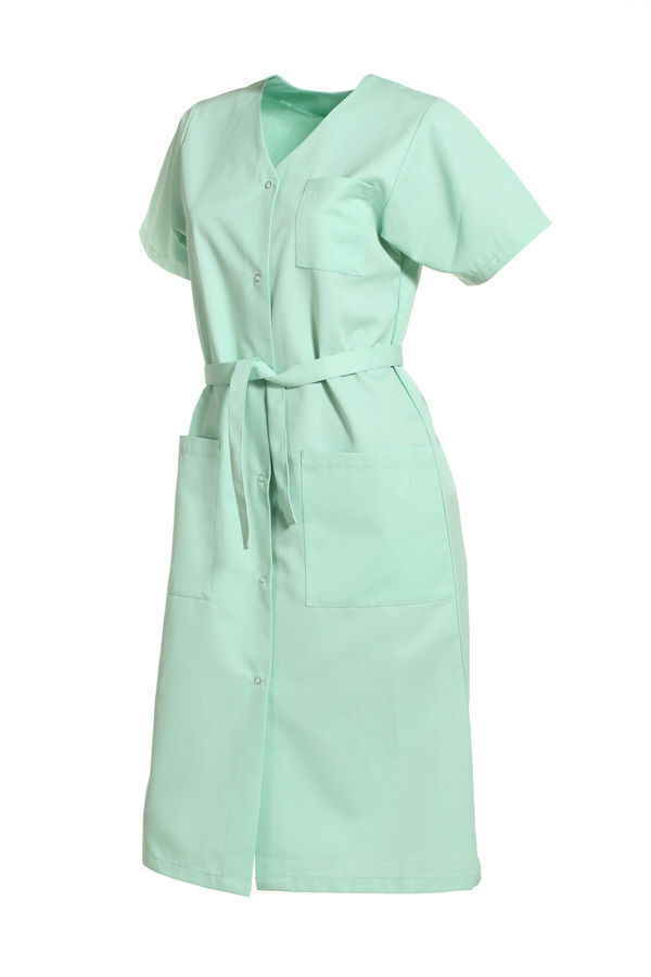 Blouse femme encolure V. Fermeture milieu devant par 6 grippers. Ceinture amovible. Poche poitrine et 2 poches basses plaquées. Manches courtes avec pattes pressionnées. Longueur : 105 cm.