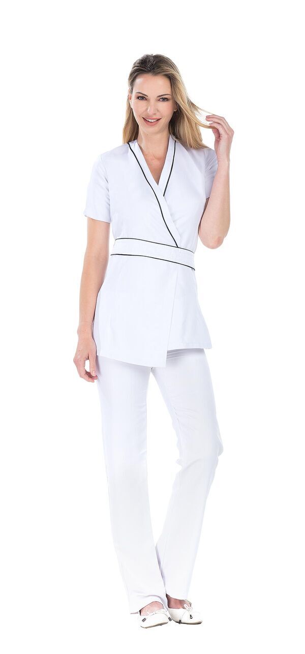 Tunique à fermeture croisée cache-cœur, ceinture et lien. Passepoil contrasté à l'encolure et ceinture. Sans poche. Manches courtes. Fentes manches et côtés. Longueur : 75 cm.